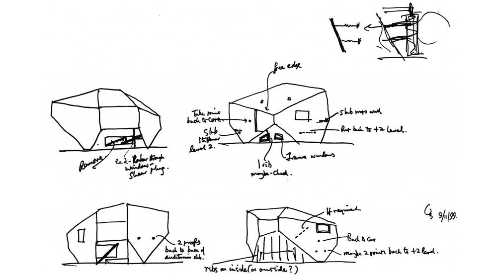Casa Da Musica is made out of a skin of shining white concrete folded into a prismatic wrap. This skin, which is its structure, orbits the concert halls, holding the entire void together. The glass ripples in waves to break up the surface for acoustic reasons. The two shoe-box shaped concert halls stand separate, structurally isolated yet suspended within form, with the main auditorium detached from the surrounding structure and the overall trapezium shape penetrating the car park levels.