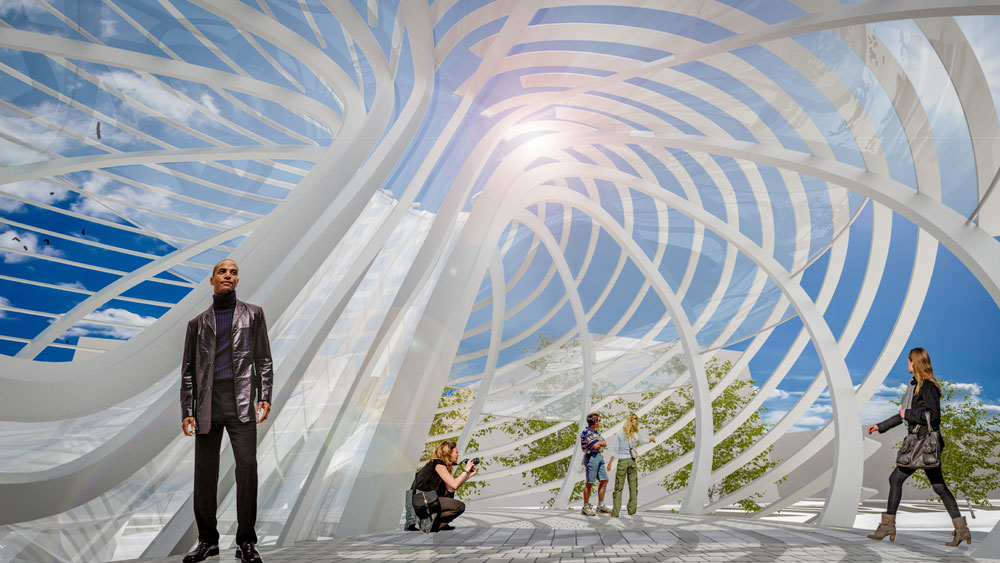 The City of Syracuse initiated an open competition in December of 2014, and after a shortlist and public presentation, landscape architect !melk + Cecil Balmond had the honour of being selected as the winner of the commission to redesign the former One Lincoln Center Plaza/Perseverance Park site. As part of an urban redevelopment, Cecil Balmond has created an integrated public art piece in the landscape, leaping from the ground and coming back down in a vortex of louvres and shifting glass. The non-symmetrical form creates momentum around the piece, engaging the eye to move inside and out around the landscape. Park residents interact with the piece by gazing through an oculus from the north end of the park and by following a ramp onto an internal platform. The spiralling louvres animate the sculpture during the spring and summer by collecting and moving rainwater around the exterior, while at winter snow gathers on them and inside the oculus.